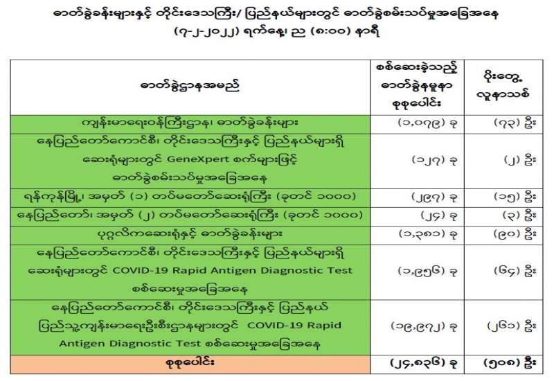 ကျန်းမာရေးဝန်ကြီးဌာနအနေဖြင့် နိုင်ငံအတွင်း ကူးစက်ဖြစ်ပွားနေသော COVID-19 ရောဂါ ကာကွယ်၊ ကုသ၊ ထိန်းချုပ်ရေးလုပ်ငန်းများကို အရှိန်အဟုန်မြှင့် ဆောင်ရွက်လျက်ရှိပါသည်။