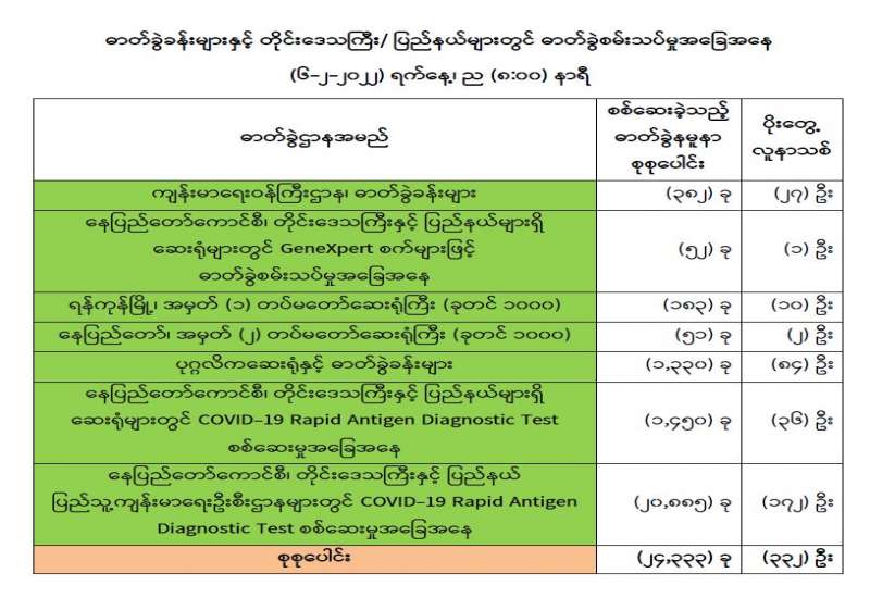 ကျန်းမာရေးဝန်ကြီးဌာနအနေဖြင့် နိုင်ငံအတွင်း ကူးစက်ဖြစ်ပွားနေသော COVID-19 ရောဂါ ကာကွယ်၊ ကုသ၊ ထိန်းချုပ်ရေးလုပ်ငန်းများကို အရှိန်အဟုန်မြှင့်ဆောင်ရွက်လျက်ရှိရာ ရောဂါထိန်းချုပ်ရေးလုပ်ငန်းများ အောင်မြင်နိုင်ရေးအတွက် ပြည်သူလူထုအနေဖြင့် ကျန်းမာရေးဝန်ကြီးဌာနမှ ထုတ်ပြန်ထားသော COVID-19 ရောဂါကာကွယ်ထိန်းချုပ်ရေး ဆိုင်ရာစည်းကမ်းများကို စနစ်တကျ လိုက်နာဆောင်ရွက်ရန်လိုအပ်ပြီး COVID-19 ကာကွယ်ဆေးထိုးနှံမှုခံယူခြင်းအား အထူးဂရုပြု ပူးပေါင်းဆောင်ရွက်ကြရန် လိုအပ်ပါသည်။