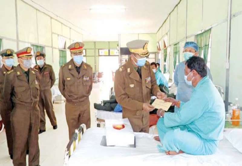 ရှမ်းပြည်နယ်(မြောက်ပိုင်း)၊ လားရှိုးမြို့ရှိ တပ်မတော်ဆေးရုံ၊ ဧရာဝတီတိုင်းဒေသကြီး၊ ပုသိမ်မြို့ရှိ နယ်မြေခံဆေးတပ်ရင်းနှင့် ပဲခူးတိုင်းဒေသ ကြီး၊ တောင်ငူမြို့ရှိ တပ်မတော်ဆေးရုံတို့၌ တက်ရောက်ကုသမှုခံယူလျက်ရှိသော အရာရှိ၊ စစ်သည်၊ မိသားစုများနှင့် ဒေသခံပြည်သူများ အား ယနေ့တွင် သက်ဆိုင်ရာတိုင်းစစ်ဌာနချုပ်များမှ တိုင်းမှူးများနှင့် အဖွဲ့ဝင်များက သွားရောက်ကြည့်ရှု၍ တစ်ဦးချင်း၏ရောဂါ ဖြစ်ပွားမှု၊ ဆေးဝါးကုသပေးထားမှုနှင့် ကျန်းမာရေး တိုးတက်မှုအခြေအနေများကို မေးမြန်းအားပေးစကားပြောကြားပြီး စားသောက်ဖွယ်ရာများနှင့် ထောက်ပံ့ငွေများ ပေးအပ်ကြသည်။