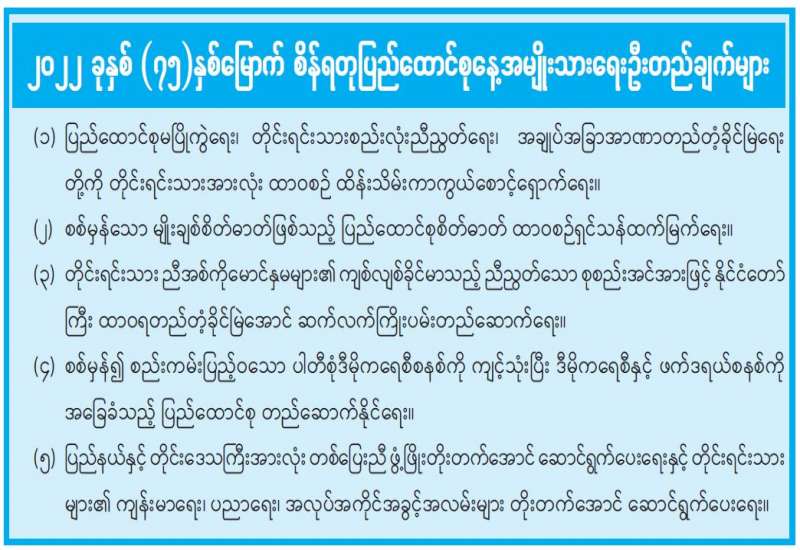 စနစ်တကျ ချွေတာသုံးစွဲ နေ့စဉ်လူမှုဘဝများတွင် ရေနှင့်မီး(လျှပ်စစ်)တို့က မရှိမဖြစ် အရေး ကြီးသည်။ သန့်ရှင်း၍ ဘေးကင်းသည့်သောက်သုံးရေနှင့် လျှပ်စစ် မီးတို့ကို မိမိတို့နိုင်ငံ၏ မြို့ပြနှင့် ကျေးလက်ဒေသအသီးသီးတို့ရှိ အိမ်ထောင်စုများအားလုံး သုံးစွဲခွင့်မရရှိသေး။ အိမ်တိုင်း၊ မိသားစုတိုင်း သောက်သုံးရေရရှိရေးနှင့် လျှပ်စစ်မီး ရရှိရေးအတွက် ကြိုးပမ်းနေရဆဲအခြေ အနေတွင်သာ ရှိသေးသည်။