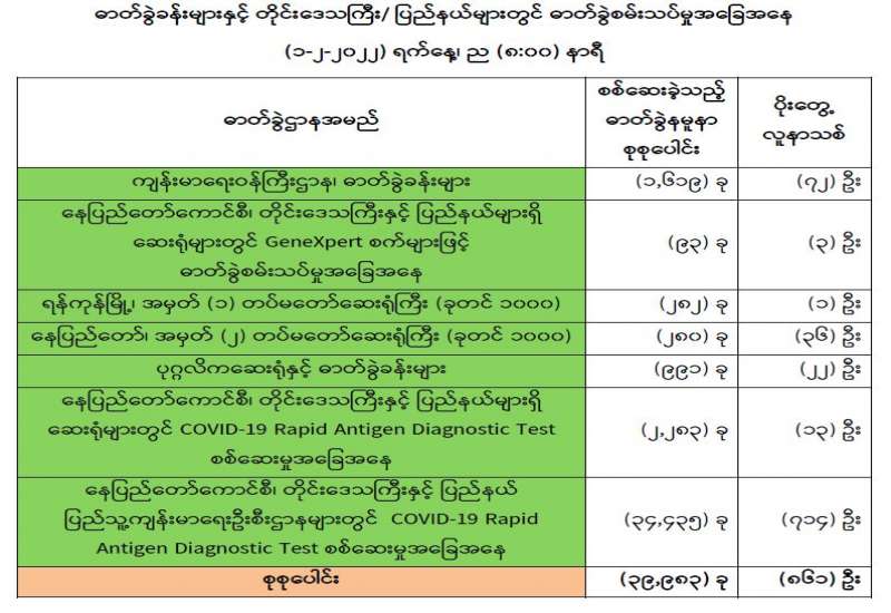ကျန်းမာရေးဝန်ကြီးဌာနအနေဖြင့် နိုင်ငံအတွင်း ကူးစက်ဖြစ်ပွားနေသော COVID-19 ရောဂါ ကာကွယ်၊ ကုသ၊ ထိန်းချုပ်ရေးလုပ်ငန်းများကို အရှိန်အဟုန်မြှင့် ဆောင်ရွက်လျက်ရှိပါသည်။