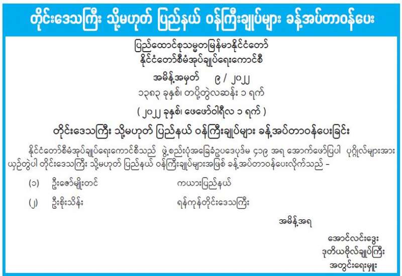 ၂၀၀၈ ခုနှစ် ဖွဲ့စည်းပုံအခြေခံဥပဒေနှင့်အညီ ဆောင်ရွက်လျက်ရှိသည့် နိုင်ငံတော်စီမံအုပ်ချုပ်ရေး ကောင်စီအား ထောက်ခံပွဲကို ယနေ့တွင် တိုင်းဒေသကြီးနှင့် ပြည်နယ်အသီးသီးရှိ မြို့နယ်များ၌ ကျင်းပသည်။