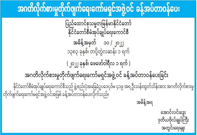 လူဝင်မှုကြီးကြပ်ရေးနှင့် ပြည်သူ့အင်အားဝန်ကြီးဌာန၊ လူဝင်မှုကြီးကြပ်ရေးနှင့် ပြည်သူ့အင်အားသင်တန်းကျောင်း၊ အမှုထမ်းအဆင့် ဘာသာရပ်ဆိုင်ရာ အခြေခံသင်တန်း အမှတ်စဉ် (၁/၂၀၂၂) သင်တန်းဖွင့်ပွဲအခမ်းအနားကို ယနေ့နံနက် ၁၀ နာရီခွဲတွင် နေပြည်တော် ဒက္ခိဏသီရိမြို့နယ်ရှိအဆိုပါ သင်တန်းကျောင်းခန်းမ၌ ကျင်းပသည်။