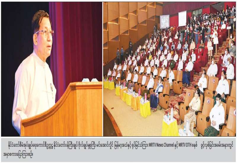 (၇၅)နှစ်မြောက် စိန်ရတုပြည်ထောင်စုနေ့ကို ကြိုဆိုဂုဏ်ပြုသောအားဖြင့် နိုင်ငံတော်စီမံအုပ်ချုပ်ရေးကောင်စီ တာဝန်ထမ်းဆောင်ခဲ့သည့် တစ်နှစ်မြောက် နှစ်ပတ်လည်နေ့ အထိမ်းအမှတ် မြန်မာ့အသံနှင့်ရုပ်မြင်သံကြား စိန်ရတုပြတိုက်၊ MRTV News Channel နှင့် MRTV DTH စနစ် ဖွင့်လှစ်ခြင်းအခမ်းအနားကို ယနေ့မွန်းလွဲပိုင်းတွင် နေပြည်တော်ကောင်စီနယ်မြေ၊ တပ်ကုန်းမြို့ရှိ မြန်မာ့အသံနှင့် ရုပ်မြင်သံကြား၌ ကျင်းပပြုလုပ်ရာ နိုင်ငံတော်စီမံအုပ်ချုပ်ရေးကောင်စီ ဥက္ကဋ္ဌ နိုင်ငံတော်ဝန်ကြီးချုပ် ဗိုလ်ချုပ်မှူးကြီး မင်းအောင်လှိုင် တက်ရောက် ဖွင့်လှစ်ပေးသည်။