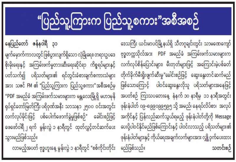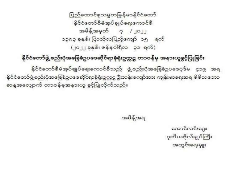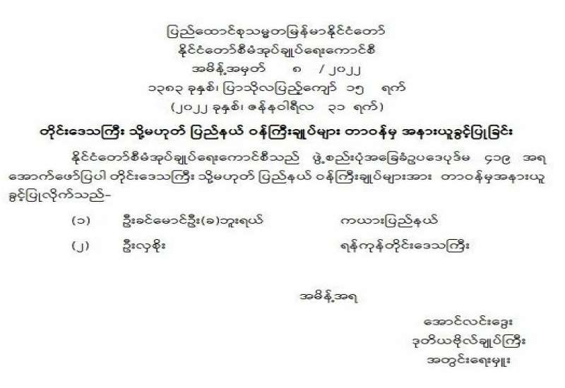 ၁။ အမျိုးသားကာကွယ်ရေးနှင့်လုံခြုံရေးကောင်စီ အစည်းအဝေးကို အမျိုးသား ကာကွယ်ရေးနှင့် လုံခြုံရေးကောင်စီ အစည်းအဝေးခန်းမ၌ ယနေ့နံနက် ၀၉၃၀ နာရီတွင် ကျင်းပပြုလုပ်ခဲ့သည်။ အစည်းအဝေးတွင် တပ်မတော်ကာကွယ်ရေးဦးစီးချုပ်၊ ဗိုလ်ချုပ်မှူးကြီး မင်းအောင်လှိုင်က နိုင်ငံရေးအရ နိုင်ငံတစ်ဝန်းလုံး အရေးပေါ်အခြေအနေကြေညာပြီးနောက် နိုင်ငံရေး၊ စီးပွားရေး၊ လူမှုရေးဖြစ်ပေါ်တိုးတက်မှု အခြေအနေများ၊ နိုင်ငံတော်တည်ငြိမ်ရေးနှင့် ရပ်ရွာ အေးချမ်း သာယာရေးတို့ကို အလေးထားဆောင်ရွက်ခဲ့သည့် အခြေအနေများ၊ ဖြစ်ပေါ်နေသည့် အခြေအနေ များကို ခြုံငုံသုံးသပ်မှုများအရ ပြည်တွင်းပြည်ပ အဖျက်သမားများနှင့် ၎င်းတို့ကို အားပေးနေသည့် လူပုဂ္ဂိုလ်များ၊ အဖွဲ့အစည်းများ၏ လိုလားချက်သည် ဒီမိုကရေစီထက် အလုံးစုံပျက်သုဉ်းရေးကို ဦးတည်ဆောင်ရွက်နေသည့် အခြေအနေများနှင့် လက်ရှိအခြေအနေ တွင် ချင်းပြည်နယ်နှင့် စစ်ကိုင်းတိုင်းဒေသကြီး အချို့တို့၌ အကြမ်းဖက် တိုက်ခိုက်မှုများ၊ ဖျက်ဆီးမှုများရှိနေသကဲ့သို့ နိုင်ငံအတွင်း မြို့နယ်အချို့တွင် ရပ်ကွက်နှင့် ကျေးရွာအုပ်ချုပ် ရေးမှူးများ ခန့်ထားရန် ကျန်ရှိနေသေးသည့် အခြေအနေများကြောင့် စစ်မှန်၍စည်းကမ်း ပြည့်ဝသော ပါတီစုံဒီမိုကရေစီစနစ်လမ်းကြောင်းပေါ် ပြန်လည်ရောက်ရှိနိုင်ရေးနှင့် ပြည်ထောင်စုသမ္မတ မြန်မာနိုင်ငံတော် ဖွဲ့စည်းပုံအခြေခံဥပဒေ (၂၀၀၈ ခုနှစ်) ပုဒ်မ ၄၂၉ အရ ပါတီစုံဒီမိုကရေစီ အထွေထွေရွေးကောက်ပွဲကို ကျင်းပပေးနိုင်ရေးတို့အတွက် ဆက်လက် ဆောင်ရွက်ပေးရန် လိုအပ်လျက်ရှိပါသဖြင့် နိုင်ငံတစ်ဝန်းလုံး အရေးပေါ်အခြေအနေ ကြေညာထားသည့်ကာလအား သက်တမ်းတိုးမြှင့်ပေးပါရန် ဖွဲ့စည်းပုံအခြေခံ ဥပဒေ (၂၀၀၈ ခုနှစ်) ပုဒ်မ ၄၂၅ အရ တင်ပြခဲ့သည်။