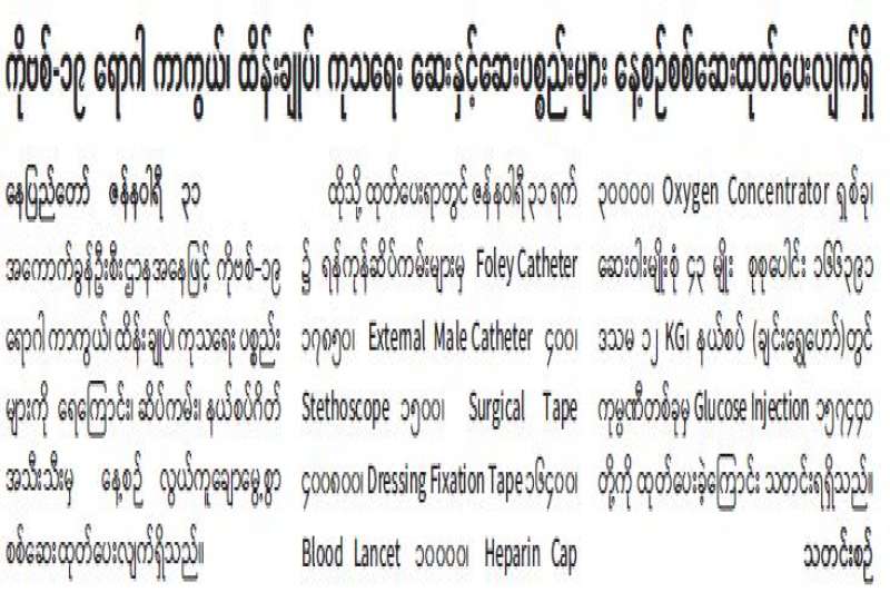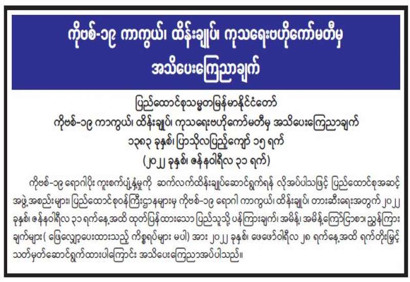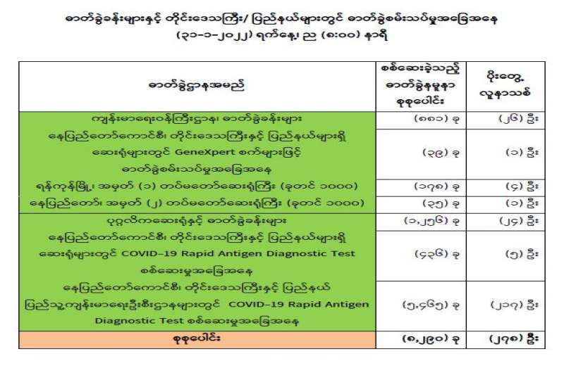 ကျန်းမာရေးဝန်ကြီးဌာနအနေဖြင့် နိုင်ငံအတွင်း ကူးစက်ဖြစ်ပွားနေသော COVID-19 ရောဂါ ကာကွယ်၊ ကုသ၊ ထိန်းချုပ်ရေးလုပ်ငန်းများကို အရှိန်အဟုန်မြှင့် ဆောင်ရွက်လျက်ရှိပါသည်။