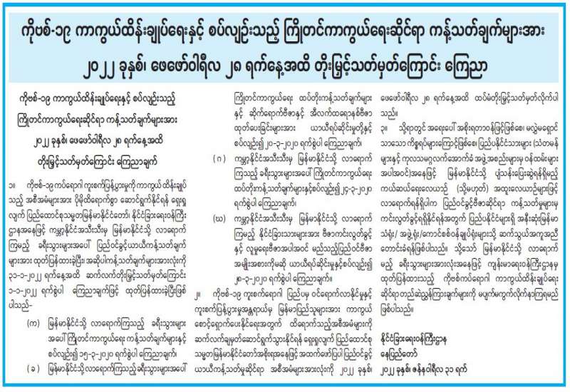 ၁။ ကျန်းမာရေးဝန်ကြီးဌာနသည် “ကိုဗစ်-၁၉ ရောဂါ မျိုးရိုးဗီဇပြောင်း ရောဂါပိုး စောင့်ကြပ် ကြည့်ရှုခြင်းလုပ်ငန်း” များကို စဉ်ဆက်မပြတ် ဆောင်ရွက်လျက်ရှိရာ မြန်မာနိုင်ငံသို့ ပြည်ပနိုင်ငံများမှ ကယ်ဆယ်ရေးလေယာဉ် (Relief Flight) များဖြင့် ပြန်လည်ဝင်ရောက်လာသူများတွင် SARS-CoV-2 Variant Omicron (အိုမီခရွန်) ရောဂါပိုးတွေ့ရှိမှုများနှင့်ပတ်သက်၍ ကျန်းမာရေးဝန်ကြီးဌာနမှ အချိန်နှင့်တစ်ပြေးညီ သတင်းထုတ်ပြန်ပေးလျက်ရှိပါသည်။