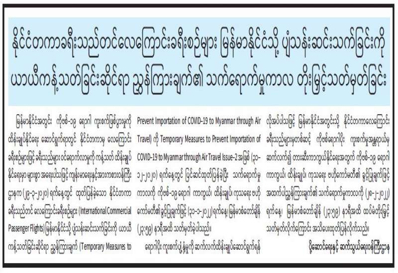 စီးပွားရေးနှင့် ကူးသန်းရောင်းဝယ်ရေးဝန်ကြီးဌာနသည် ကိုဗစ်-၁၉ ရောဂါကူးစက်မှု နောက်ဆက်တွဲအနေဖြင့် စီးပွားရေးလုပ်ငန်းများ တုံ့ဆိုင်းခြင်းကို ပြန်လည်ကုစားနိုင်ရန်၊ နိုင်ငံ၏ ပို့ကုန်တင်ပို့မှု၊ သွင်းကုန်တင်သွင်းမှုများ စနစ်တကျရှိစေရန်နှင့် ပြည်ပမှကုန်စည်များတင်သွင်းမှု အတွက် နိုင်ငံခြားငွေကြေးအသုံးပြုမှုကို ထိန်းညှိဆောင်ရွက်နိုင်ရန်ရည်ရွယ်၍ ပြည်ပမှတင်သွင်းမှုများသည့် ကုန်စည်များကို သွင်းကုန် လိုင်စင်စနစ်ဖြင့် ဆောင်ရွက်လျက်ရှိကြောင်း သိရသည်။
