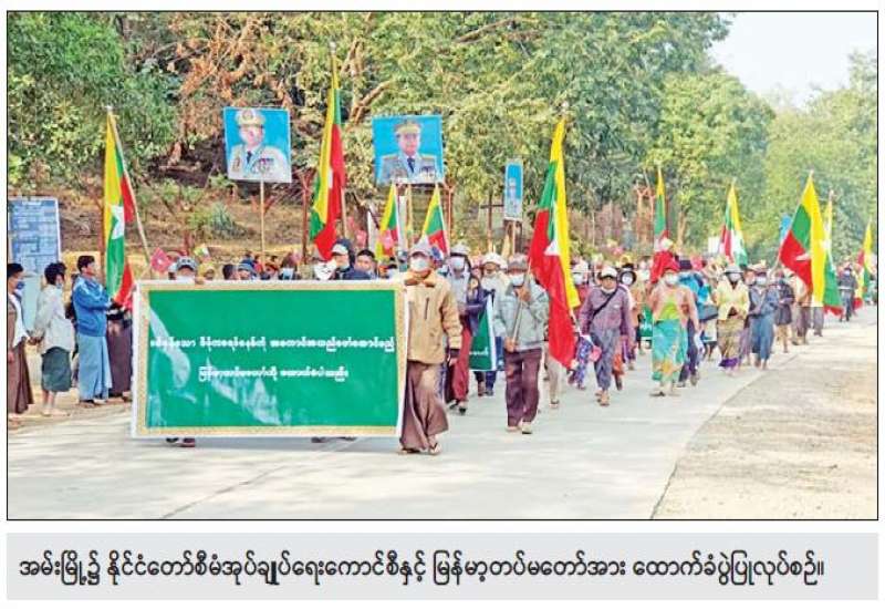 ၂၀၀၈ ခုနှစ် ဖွဲ့စည်းပုံအခြေခံဉပဒေနှင့်အညီ ဆောင်ရွက်လျက်ရှိသည့် နိုင်ငံတော် စီမံအုပ်ချုပ်ရေးကောင်စီအား ထောက်ခံပွဲကို ယနေ့တွင် ကချင်ပြည်နယ်၊ မြစ်ကြီးနားမြို့၌ လည်းကောင်း၊ ရှမ်းပြည်နယ် (မြောက်ပိုင်း)၊ ကွမ်းလုံမြို့နှင့် လောက်ကိုင်မြို့တို့၌ လည်းကောင်း၊ ရှမ်းပြည်နယ်(တောင်ပိုင်း)၊ လွိုင်လင်မြို့နှင့် နမ့်စန်မြို့၌လည်းကောင်း၊ ရှမ်းပြည်နယ် (အရှေ့ပိုင်း) အတွင်းရှိ မြို့နယ် ၅ မြို့နယ်တို့၌ လည်းကောင်း၊ မွန်ပြည် နယ်အတွင်းရှိ မြို့နယ် ၆ မြို့နယ်နှင့် ကရင်ပြည်နယ်၊ လှိုင်းဘွဲမြို့၌လည်းကောင်း၊ ရန်ကုန်တိုင်းဒေသကြီး၊ မရမ်းကုန်းမြို့နယ်နှင့် ကမာရွတ်မြို့နယ်၌လည်းကောင်း၊ ဧရာဝတီတိုင်းဒေသကြီး၊ ကျိုက်လတ် မြို့၌လည်းကောင်း၊ ရခိုင်ပြည်နယ်အတွင်းရှိ မြို့နယ် ၈ မြို့နယ်နှင့် ချင်းပြည်နယ်၊ ပလက်ဝမြို ့တို့၌ လည်း ကောင်း၊ စစ်ကိုင်းတိုင်းဒေသကြီး၊ မုံရွာမြို့၊ ခန္တီးမြို့နှင့် မော်လိုက်မြို့၌ လည်း ကောင်း၊ မန္တလေးတိုင်းဒေသကြီးအတွင်းရှိ မြို့နယ် ၁၆ မြို့နယ်နှင့် မကွေးတိုင်း ဒေသကြီး အတွင်းရှိ မြို့နယ် ၅ မြို့ နယ်တို့၌လည်းကောင်း အသီးသီးပြုလုပ်ကြပြီး ဆန္ဒဖော်ထုတ်ခဲ့ကြသည်။