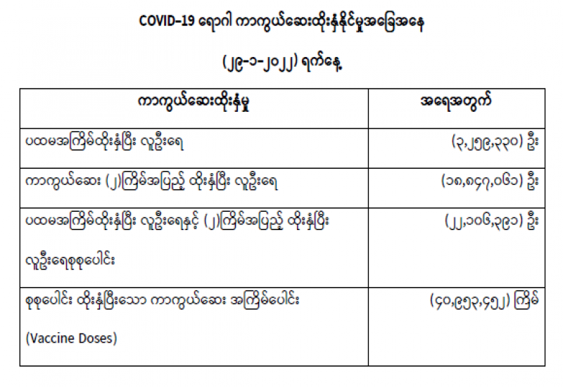 ကျန်းမာရေးဝန်ကြီးဌာနအနေဖြင့် နိုင်ငံအတွင်း ကူးစက်ဖြစ်ပွားနေသော COVID-19 ရောဂါ ကာကွယ်၊ ကုသ၊ ထိန်းချုပ်ရေး လုပ်ငန်းများကို အရှိန်အဟုန်မြှင့်ဆောင်ရွက်လျက်ရှိရာ ရောဂါထိန်းချုပ်ရေးလုပ်ငန်းများ အောင်မြင်နိုင်ရေးအတွက် ပြည်သူလူထု အနေဖြင့် ကျန်းမာရေးဝန်ကြီးဌာနမှ ထုတ်ပြန်ထားသော COVID-19 ရောဂါကာကွယ်ထိန်းချုပ်ရေးဆိုင်ရာ စည်းကမ်းများကို စနစ်တကျ လိုက်နာဆောင်ရွက်ရန်လိုအပ်ပြီး COVID-19 ကာကွယ်ဆေးထိုး နှံမှုခံယူခြင်းအား အထူးဂရုပြု ပူးပေါင်းဆောင်ရွက် ကြရန်လိုအပ်ပါသည်။