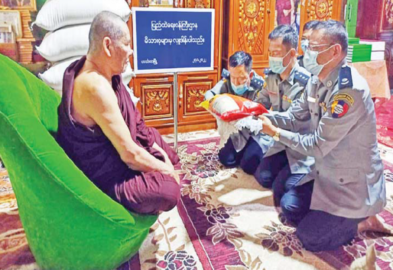 ကိုဗစ်-၁၉ ရောဂါ ကြိုတင်ကာကွယ်ရေးလုပ်ငန်းများ ဆောင်ရွက်နေသည့် ကာလအတွင်း ဆွမ်းကိစ္စရပ်များ အဆင်ပြေစေရန် ရည်ရွယ်၍ ပြည်ထဲရေး ဝန်ကြီးဌာန၊ တပ်ဖွဲ့ဝင်/ ဝန်ထမ်း အရာထမ်း၊ အမှုထမ်း မိသားစုများက မြို့နယ်အသီးသီးရှိ ဘုန်းတော်ကြီးကျောင်းများသို့ ဆွမ်းဆန်တော်များ ဆက်ကပ်လှူဒါန်းခြင်းကို ဆောင်ရွက်လျက်ရှိသည်။
