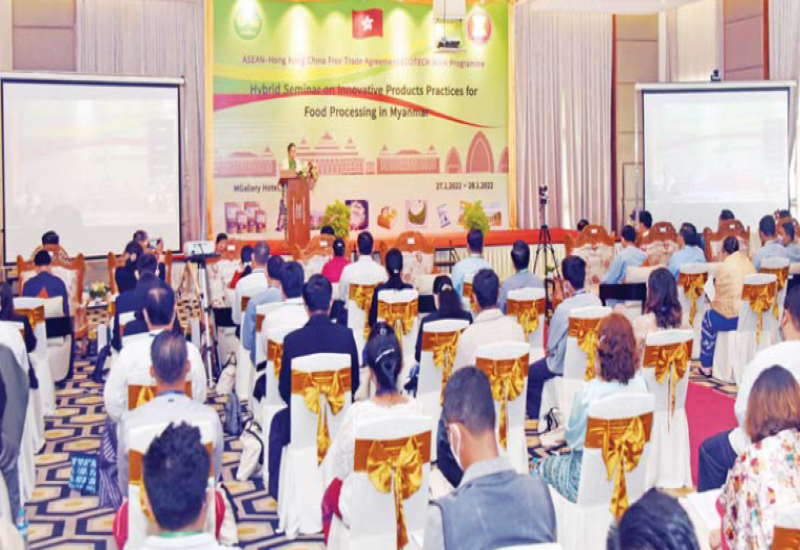 စားသောက်ကုန်ထုတ်လုပ်မှု လုပ်ငန်းများအတွက် ဆန်းသစ်တီထွင်မှု အလေ့အကျင့်ကောင်းများ မျှဝေခြင်း စီမံကိန်းဆိုင်ရာ ဆွေးနွေးပွဲ (Hybrid Seminar on Innovative Products Practices for Food Processing in Myanmar)ဖွင့်ပွဲအခမ်းအနားကို ယနေ့နံနက် ၉ နာရီတွင် နေပြည်တော်ရှိ M Gallery Hotel၌ ကျင်းပသည်။
