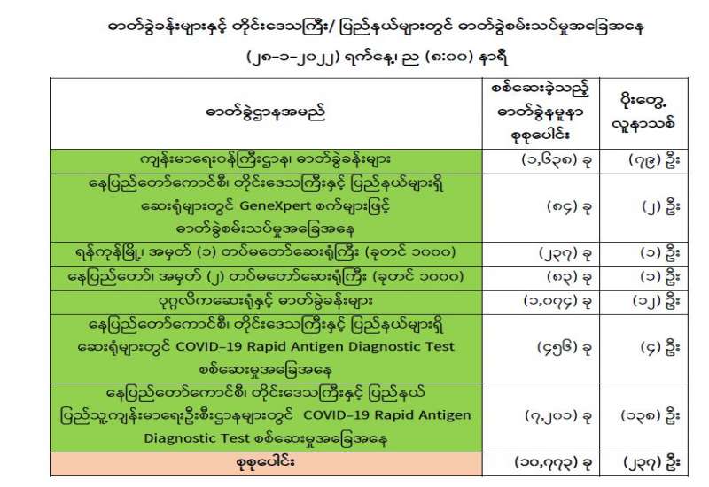 ကျန်းမာရေးဝန်ကြီးဌာနအနေဖြင့် နိုင်ငံအတွင်း ကူးစက်ဖြစ်ပွားနေသော COVID-19 ရောဂါ ကာကွယ်၊ ကုသ၊ ထိန်းချုပ်ရေးလုပ်ငန်းများကို အရှိန်အဟုန်မြှင့်ဆောင်ရွက်လျက်ရှိပါသည်။