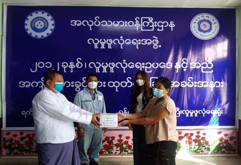 အလုပ်သမားဝန်ကြီးဌာန၊ လူမှုဖူလုံရေးအဖွဲ့၊ မြို့နယ်လူမှုဖူလုံရေးရုံးခွဲ(၇)တွင် အကျုံးဝင် မှတ်ပုံတင်ထားသည့် အာမခံအလုပ်သမား၏ လုပ်ငန်းခွင်မတော်တဆထိခိုက်သေဆုံးမှုအတွက် ဥပဒေနှင့်အညီ အကျိုးခံစားခွင့် ထုတ်ပေးခြင်းကို ယနေ့နံနက်ပိုင်းတွင် ရန်ကုန်မြို့ တိုင်းဒေသကြီးလူမှုဖူလုံရေးရုံး တိုင်းအစည်းအဝေးခန်းမ၌ ပြုလုပ်သည်။