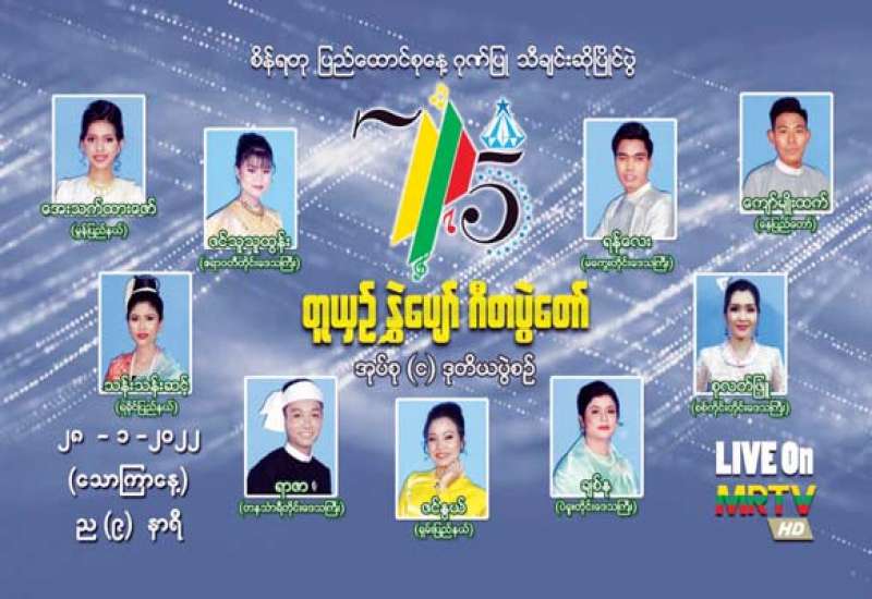 စိန်ရတုပြည်ထောင်စုနေ့ကို ဂုဏ်ပြုသောအားဖြင့် “တူယှဉ်နွှဲပျော် ဂီတပွဲတော်” သီချင်းဆို ပြိုင်ပွဲ အုပ်စု(င) ဒုတိယပွဲစဉ်ကို ဇန်နဝါရီ ၂၈ ရက် (သောကြာနေ့) ညတွင် မြန်မာ့အသံနှင့် ရုပ်မြင်သံကြားမှ တိုက်ရိုက် Live ရိုက်ကူးထုတ်လွှင့်မည်။