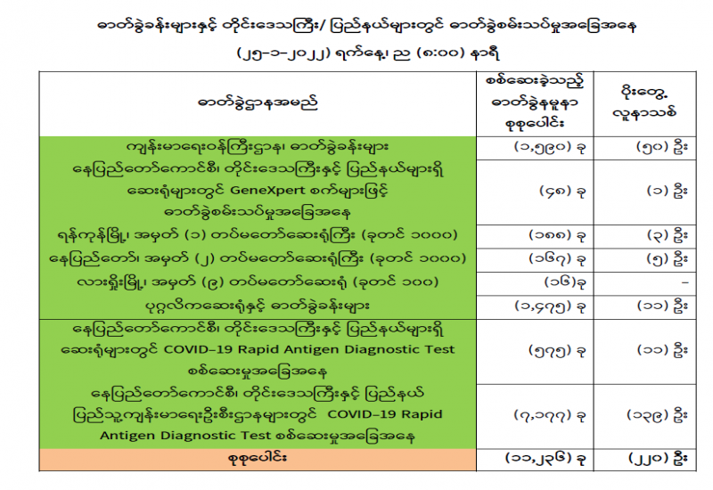 ကျန်းမာရေးဝန်ကြီးဌာနအနေဖြင့် နိုင်ငံအတွင်း ကူးစက်ဖြစ်ပွားနေသော COVID-19 ရောဂါ ကာကွယ်၊ ကုသ၊ ထိန်းချုပ်ရေးလုပ်ငန်းများကို အရှိန်အဟုန်မြှင့် ဆောင်ရွက်လျက်ရှိပါသည်။