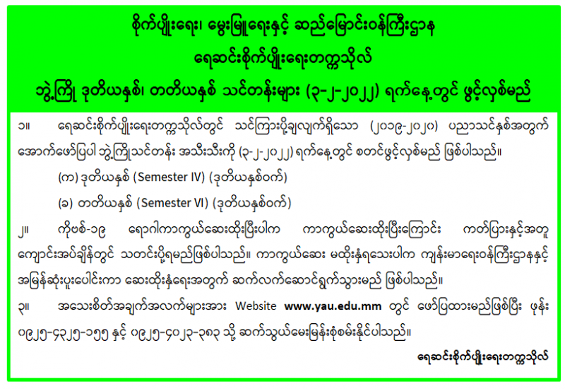 ၁။ မွေးမြူရေးဆိုင်ရာဆေးတက္ကသိုလ်တွင် သင်ကြားပို့ချလျက်ရှိသော (၂၀၁၉-၂၀၂၀) ပညာသင်နှစ်အတွက် အောက်ဖော်ပြပါ ဘွဲ့ကြို သင်တန်းအသီးသီးကို (၃-၂-၂၀၂၂) ရက်နေ့တွင် စတင်ဖွင့်လှစ်မည် ဖြစ်ပါသည်-
