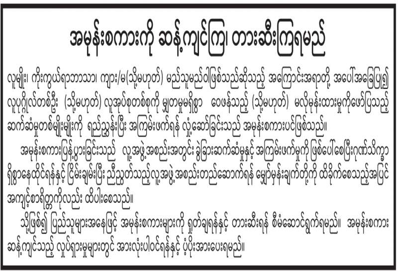 လူမျိုး၊ ကိုးကွယ်ရာဘာသာ၊ ကျား/မ(သို့မဟုတ်) မည်သူမည်ဝါဖြစ်သည်ဆိုသည့် အကြောင်းအရာတို့အပေါ်အခြေပြု၍ လူပုဂ္ဂိုလ်တစ်ဦး(သို့မဟုတ်)လူအုပ်စုတစ်စုကို မျှတမှုမရှိစွာဝေဖန်သည့် (သို့မဟုတ်)မလိုမုန်းထားမှုကိုဖော်ပြသည့် ဆက်ဆံမှုတစ်မျိုးမျိုးကိုရည်ညွှန်းပြီး အကြမ်းဖက်ရန်လှုံ့ဆော်ခြင်းသည် အမုန်းစကားပင်ဖြစ်သည်။ အမုန်းစကားပြန့်ပွားခြင်းသည် လူ့အဖွဲ့အစည်းအတွင်းခွဲခြားဆက်ဆံမှုနှင့် အကြမ်းဖက်မှုကို ဖြစ်ပေါ်စေပြီးဂုဏ်သိက္ခာရှိစွာနေထိုင်ရန်နှင့် ငြိမ်းချမ်းပြီးညီညွတ်သည့်လူ့အဖွဲ့အစည်းတည်ဆောက်ရန်မျှော်မှန်းချက်တို့ကို ထိခိုက်စေသည့်အပြင် အကျင့်စာရိတ္တကိုလည်း ထိပါးစေသည်။ သို့ဖြစ်၍ ပြည်သူများအနေဖြင့် အမုန်းစကားများကို ရှုတ်ချရန်နှင့်တားဆီးရန်စီမံဆောင်ရွက်ရမည်။ အမုန်းစကားဆန့်ကျင်သည့် လှုပ်ရှားမှုများတွင် အားလုံးပါဝင်ရန်နှင့် ပံ့ပိုးအားပေးရမည်။