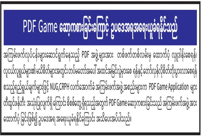 အကြမ်းဖက်လုပ်ငန်းများဆောင်ရွက်နေသည့် PDF အဖွဲ့များအားတစ်ဖက်တစ်လမ်းမှ ထောက်ပံ့လှူဒါန်းစေရန်၊ လူငယ်လူရွယ်များ၏မသိစိတ်များအတွင်း တပ်မတော်အပေါ်အထင်အမြင်လွဲမှားစေရန်နှင့် တော်လှန်လိုစိတ်တိုးပွားလာစေရန်စသည့်ရည်ရွယ်ချက်များဖြင့် NUG,CRPH လက်အောက်ခံ အကြမ်းဖက်အဖွဲ့အစည်းများက PDF Game Application များ တီထွင်ဖန်တီးအသုံးပြုလျက်ရှိကြောင်း စိစစ်တွေ့ရှိရသည့်အတွက် PDF Game ဆော့ကစားခြင်းသည် အကြမ်းဖက်အဖွဲ့အား ထောက်ပံ့ခြင်းဖြစ်၍ ဥပဒေအရ အရေးယူခံရနိုင်ကြောင်း အသိပေးအပ်ပါသည်။