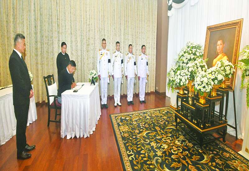 ထိုင်းနိုင်ငံ ဘုရင်မင်းမြတ်၏ မယ်တော်မိဖုရားကြီး Her Maje-sty Queen Sirikit သည် ၂၀၂၅ ခုနှစ် အောက်တိုဘာ ၂၄ ရက်တွင် ကံတော်ကုန်သွားခဲ့ခြင်းအတွက် ပြည်ထောင်စုသမ္မတမြန်မာနိုင်ငံအစိုးရကိုယ်စား နိုင်ငံတော်သမ္မတရုံး ဝန်ကြီးဌာန(၁) ပြည်ထောင်စုဝန်ကြီး ဦးတင်အောင်စန်းသည် အမှတ် ၉၄၊ ပြည်လမ်း၊ ဒဂုံမြို့နယ်၊ ရန်ကုန်မြို့ရှိ မြန်မာနိုင်ငံဆိုင်ရာ ထိုင်းနိုင်ငံသံရုံး၌ ဖွင့်လှစ်ထားသည့် ဝမ်းနည်းကြောင်းမှတ်တမ်းစာအုပ်၌ ယနေ့မွန်းလွဲပိုင်းတွင် သွားရောက်လက်မှတ်ရေးထိုးသည်။