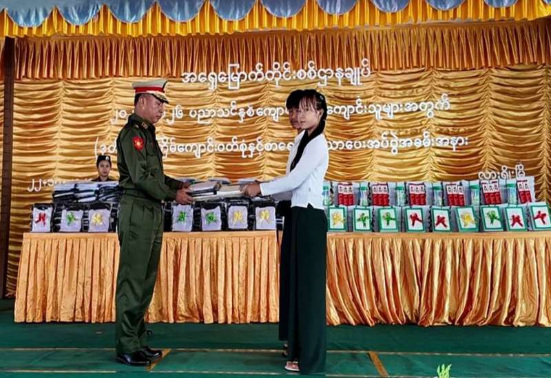 ၂၀၂၅-၂၀၂၆ ပညာသင်နှစ်တွင် တက်ရောက်ပညာသင်ကြားလျက်ရှိသည့် အရှေ့မြောက်တိုင်းစစ်ဌာနချုပ်ရှိ တပ်မတော်သား မိသားစုဝင် ကျောင်းသား၊ ကျောင်းသူများအား(ဒုတိယအကြိမ်)ကျောင်းဝတ်စုံနှင့် စာရေးကိရိယာများပေးအပ်ခြင်းကို ယနေ့နံနက်ပိုင်းတွင် ရှမ်းပြည်နယ်(မြောက်ပိုင်း)၊ လားရှိုးမြို့ရှိ အမှတ်(၇)အခြေခံပညာအထက်တန်းကျောင်း၊ ပညာရတနာခန်းမ၌ ပြုလုပ်ရာ တိုင်းမှူး ဗိုလ်မှူးချုပ်အေးမင်းဦးနှင့် အရာရှိ၊ စစ်သည်၊ မိသားစုများ၊ ဆရာ၊ ဆရာမများ၊ ကျောင်းသား၊ ကျောင်းသူများနှင့် ဖိတ်ကြားထားသူများ တက်ရောက်ကြသည်။
