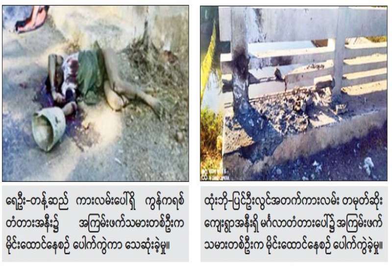 စစ်ကိုင်းတိုင်းဒေသကြီး၊ တန့်ဆည်မြို့နယ် ရေဦး-တန့်ဆည်ကားလမ်းပေါ်ရှိ ကွန်ကရစ် တံတား နှင့် မန္တလေးတိုင်းဒေသကြီး၊ အမရပူရမြို့နယ်၊ ထုံးဘို-ပြင်ဦးလွင်လားပေါ်ရှိ မင်္ဂလာတံတားတို့အား အကြမ်းဖက်သမားတို့က ဖျက်ဆီးရန်အတွက် မိုင်းထောင် နေစဉ် ပေါက်ကွဲမှုဖြစ်ပွားကာ အကြမ်းဖက်သမားများ သေဆုံးခဲ့ကြောင်း သိရသည်။