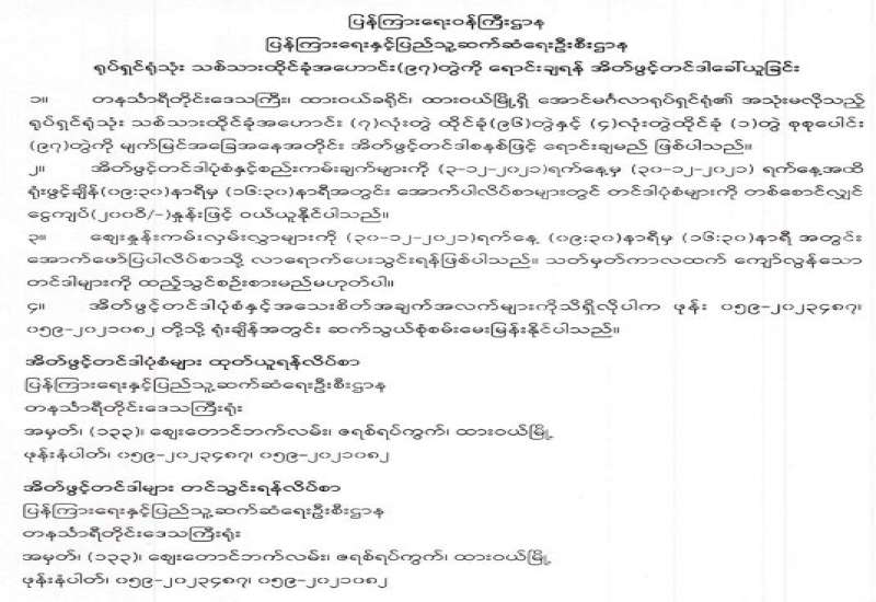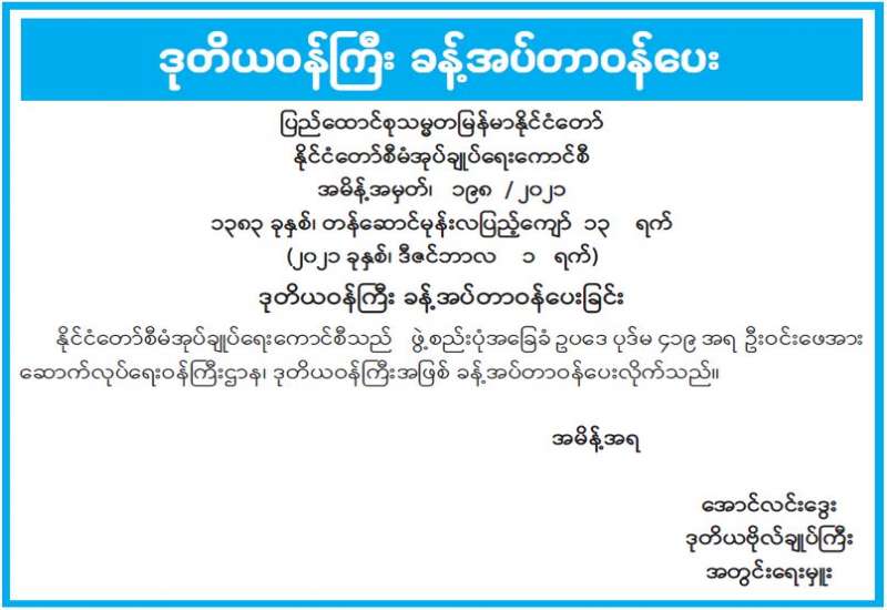 “ဝန်ထမ်းနောင်ရေးဗဟိုရန်ပုံငွေ အကောင်အထည်ဖော်ရေးကော်မတီ” (၂/၂၀၂၁) အစည်းအဝေးကို ယနေ့မွန်းလွဲ ၂ နာရီတွင် နေပြည်တော်ရှိ စီမံကိန်းနှင့်ဘဏ္ဍာရေးဝန်ကြီးဌာန အစည်းအဝေးခန်းမ၌ ကျင်းပသည်။