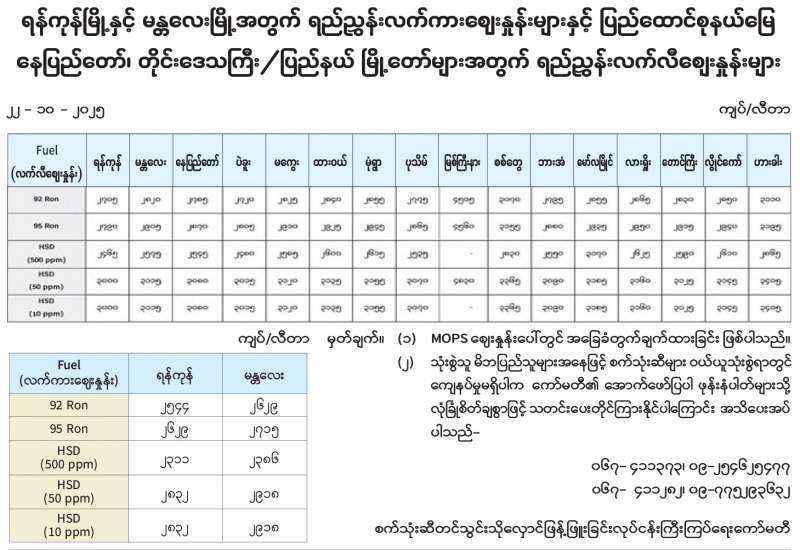 ရန်ကုန်မြို့နှင့် မန္တလေးမြို့အတွက် ရည်ညွှန်းလက်ကားဈေးနှုန်းများနှင့် ပြည်ထောင်စုနယ်မြေနေပြည်တော်၊ တိုင်းဒေသကြီး/ပြည်နယ် မြို့တော်များအတွက် ရည်ညွှန်းလက်လီစျေးနှုန်းများ