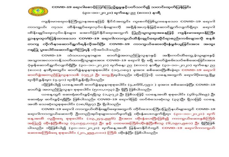 မြန်မာနိုင်ငံအတွင်း ကိုဗစ်-၁၉ ရောဂါ ကူးစက်ဖြစ်ပွားမှုကို ထိန်းချုပ်နိုင်ရေး ဆောင်ရွက်ရာတွင် နိုင်ငံတကာမှ လေကြောင်းခရီးစဉ်များဖြင့် ခရီးသည်များ ဝင်ရောက်လာမှုကို ကန့်သတ် ထိန်းချုပ်နိုင်ရေးမှာ များစွာ အရေးပါသဖြင့် ကျန်းမာရေးဝန်ကြီးဌာနက (၂၉-၃-၂၀၂၀) ရက်နေ့တွင် ထုတ်ပြန်ခဲ့သော နိုင်ငံတကာ ခရီးသည်တင် လေကြောင်းခရီးစဉ်များ (International Commercial Passenger Flights) မြန်မာနိုင်ငံသို့ ပျံသန်းဆင်းသက်ခြင်းကို ယာယီကန့်သတ်ခြင်းဆိုင်ရာ ညွှန်ကြားချက် (Temporary Measures to Prevent Importation of COVID-19 to Myanmar through Air Travel) ကို Temporary Measures to Prevent Importation of COVID-19 to Myanmar through Air Travel Issue-2 အဖြစ် (၃၁-၁၂-၂၀၂၀) ရက်နေ့တွင် ပြင်ဆင်ထုတ်ပြန်ခဲ့ပြီး သက်ရောက်မှုကာလကို ကိုဗစ်-၁၉ ကာကွယ်၊ ထိန်းချုပ်၊ ကုသရေး ဗဟိုကော်မတီ၏ ခွင့်ပြုချက်ဖြင့် (၃၁-၁၀-၂၀၂၁) ရက်နေ့၊ မြန်မာစံတော်ချိန် (၂၃:၅၉) နာရီအထိ သတ်မှတ်ခဲ့ပါသည်။
