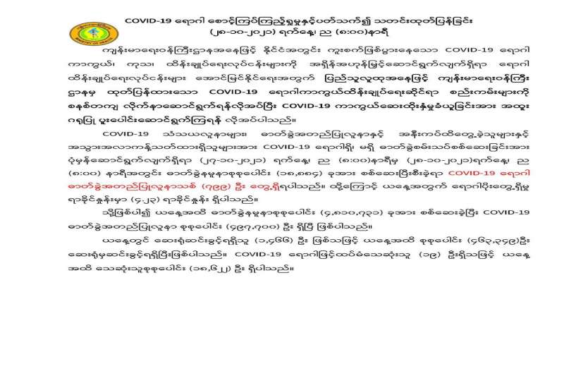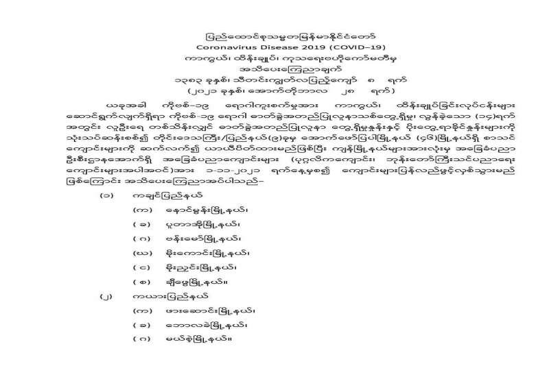 ကိုဗစ်-၁၉ ရောဂါ ကူးစက်မှု များပြားခဲ့သည့်အတွက် မိမိနေအိမ်တွင် နေထိုင်ရန် Stay at Home အစီအစဉ်တွင် အကျုံးဝင်ခဲ့သည့် မြို့နယ် များကို ပိုးတွေ့လူနာများ လျော့နည်းလာကြောင်း စိစစ်တွေ့ရှိချက် အရ အောက်တိုဘာ ၂၇ ရက်က ပယ်ဖျက်ပေးလိုက်ပြီဖြစ်သည်။