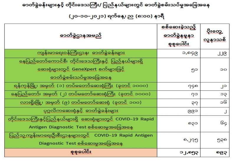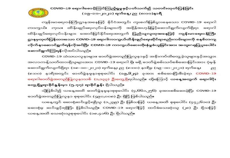 ကျန်းမာရေးဝန်ကြီးဌာနအနေဖြင့် နိုင်ငံအတွင်း ကူးစက်ဖြစ်ပွားနေသော COVID-19 ရောဂါ ကာကွယ်၊ ကုသ၊ ထိန်းချုပ်ရေးလုပ်ငန်းများကို အရှိန်အဟုန်မြှင့်ဆောင်ရွက်လျက်ရှိရာ ရောဂါထိန်းချုပ် ရေးလုပ်ငန်းများ အောင်မြင်နိုင်ရေးအတွက် ပြည်သူလူထုအနေဖြင့် -