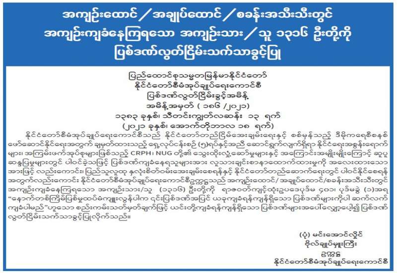 အကျဉ်းထောင် /အချုပ်ထောင်/စခန်းအသီးသီးတွင် အကျဉ်းကျခံနေကြရသော အကျဉ်းသား/သူ ၁၃၁၆ ဦးတို့ကို ပြစ်ဒဏ်လွတ်ငြိမ်းသက်သာခွင့်ပြု