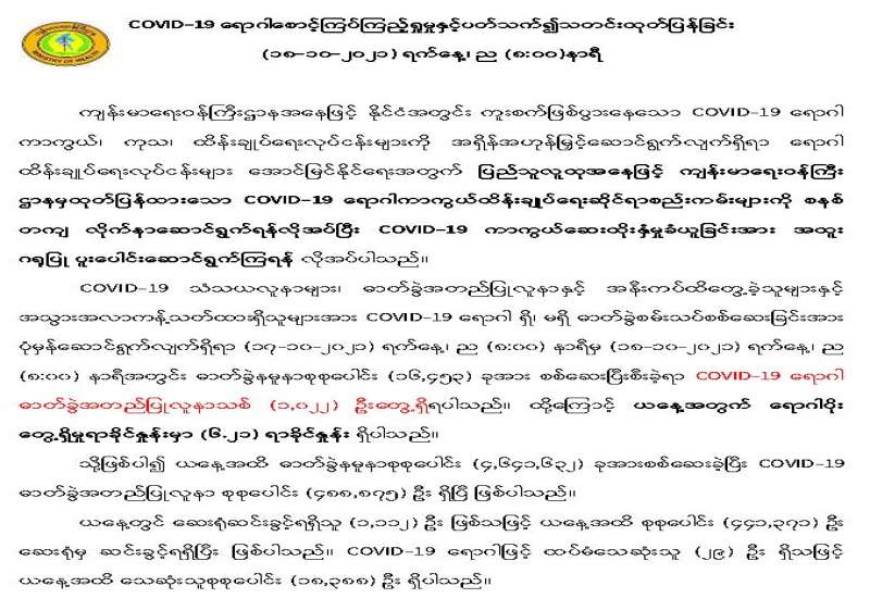 COVID-19 ရောဂါစောင့်ကြပ်ကြည့်ရှုမှုနှင့်ပတ်သက်၍သတင်းထုတ်ပြန်ခြင်း (၁၈-၁၀-၂၀၂၁) ရက်နေ့၊ ည (၈:၀၀)နာရီ