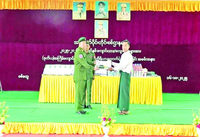 ၂၀၂၅−၂၀၂၆ ပညာသင်နှစ်တွင် တက်ရောက်ပညာသင်ကြားလျက်ရှိသည့် အနောက်ပိုင်းတိုင်းစစ်ဌာနချုပ်မှ တပ်မတော်မိသားစုဝင် ကျောင်းသားကျောင်းသူများအား(ဒုတိယအကြိမ်)ကျောင်းဝတ်စုံနှင့်စာရေးကိရိယာများပေးအပ်ခြင်းကို ယနေ့တွင် စစ်တွေတပ်နယ်ခန်းမ၌ပြုလုပ်ရာ တိုင်းမှူး ဗိုလ်ချုပ်ကျော်စွာဦးနှင့် တာဝန်ရှိသူများ၊ အရာရှိ၊ စစ်သည်၊ မိသားစုများ၊ ကျောင်းသား ကျောင်းသူများ တက်ရောက်ကြသည်။
