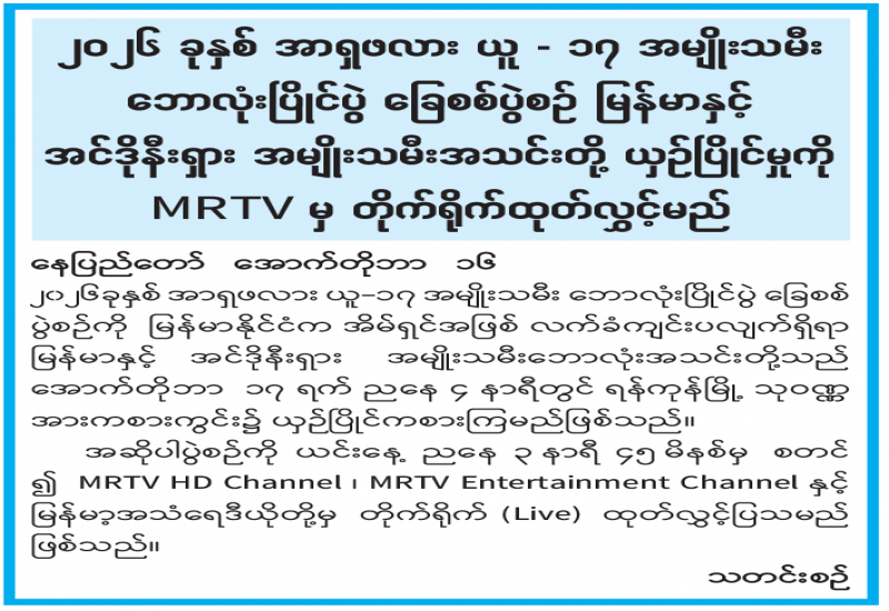 ၂၀၂၆ ခုနှစ် အာရှဖလား ယူ - ၁၇ အမျိုးသမီးဘောလုံးပြိုင်ပွဲ ခြေစစ်ပွဲစဉ် မြန်မာနှင့် အင်ဒိုနီးရှား အမျိုးသမီးအသင်းတို့ ယှဉ်ပြိုင်မှုကို MRTV မှ တိုက်ရိုက်ထုတ်လွှင့်မည်
