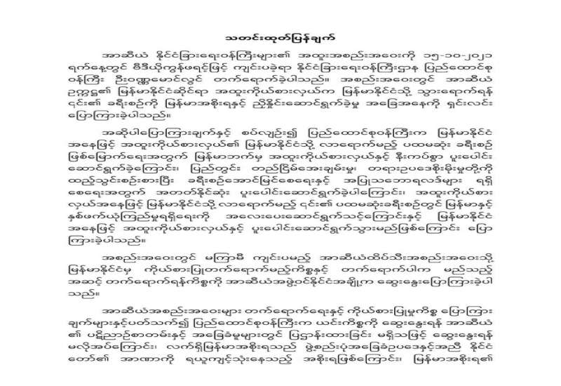 “မပြောဘဲနေတာ ကြာလာတဲ့အခါ မစဉ်းစားဖြစ်ဖို့လည်း ပိုပြီးလွယ်လာတယ်” ဆိုတဲ့စကား အတိုင်း အမိနိုင်ငံအတွက် အဓိကလိုအပ်သည့် ငြိမ်းချမ်းရေးလုပ်ငန်းစဉ် များသည် ရပ်တန့်နေ၍ မဖြစ်နိုင်ပါ။ ပြောနေ၊ ဆိုနေ၊ ညှိနှိုင်းနေမှ မည်ကဲ့သို့တိုးတက်အောင် ဆောင်ရွက်မည်ဆိုသည့် စဉ်းစားချက်၊ တွေးခေါ်ချက်များ သက်ဆိုင်ရာအဖွဲ့အစည်းများ၌ အစဉ်အမြဲ ကိန်းအောင်း နေမည်ဖြစ်ပါသည်” ဟု နိုင်ငံတော် စီမံအုပ်ချုပ်ရေး ကောင်စီ ဥက္ကဋ္ဌ၊ နိုင်ငံတော်ဝန်ကြီးချုပ်၊ အမျိုးသားစည်းလုံး ညီညွတ်ရေးနှင့် ငြိမ်းချမ်းရေးဖော်ဆောင်မှုဗဟိုကော်မတီဥက္ကဋ္ဌ၊ တပ်မတော် ကာကွယ်ရေး ဦးစီးချုပ်က NCA ချုပ်ဆိုခြင်း (၆) နှစ်မြောက် နှစ်ပတ်လည်နေ့တွင် ပေးပို့သည့် သဝဏ်လွှာ၌ ပြောကြားခဲ့သည်။