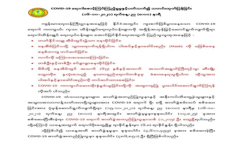 စီးပွားရေးနှင့် ကူးသန်းရောင်းဝယ်ရေးဝန်ကြီးဌာန အနေဖြင့် ကိုဗစ်-၁၉ ရောဂါကာကွယ်၊ ထိန်းချုပ်၊ ကုသရေးဆိုင်ရာပစ္စည်းများကို လေကြောင်း၊ ရေကြောင်းနှင့်နယ်စပ် ကုန်သွယ်ရေးစခန်း များမှနှောင့်နှေးကြန့်ကြာမှုမရှိ တင်သွင်းနိုင်ရေးအတွက် အချိန်နှင့် တစ်ပြေးညီ စီစဉ် ဆောင်ရွက်ပေးလျက်ရှိရာ ယနေ့တွင် ရန်ကုန်အပြည်ပြည်ဆိုင်ရာ ဆိပ်ကမ်းများ၊ ချင်းရွှ ေဟော်နှင့် မြဝတီကုန်သွယ် ရေးစခန်း (၂) ခုတို့မှ တင်သွင်းရာ၌ ကုမ္ပဏီ (၂) ခုမှယာဉ်စီးရေ (၃) စီးဖြင့် အောက်ဆီဂျင် အရည် (Bowser) ယာဉ် (၁) စီး တန်(၂၀) ၊ အောက်ဆီဂျင် (အိုးခွံ) (၄၈၀)၊ Oxygen Plant (၂) ခု၊ လုပ်ငန်းသုံး အောက်ဆီဂျင်စက် (Oxygen Generator (၂) ခုတို့ကိုတင်သွင်းခဲ့သည်။ အောက်ဆီဂျင် (အရည်) Bowser ယာဉ်(၁) စီးမှာ မြဝတီမှ ရန်ကုန်မြို့သို့ဖြစ်ပြီး Oxygen Plant (၂) ခုမှာချင်းရွှေဟော်မှ လွိုင်ကော်မြို့သို့ ဖြစ်ကြောင်း သိရှိရသည်။