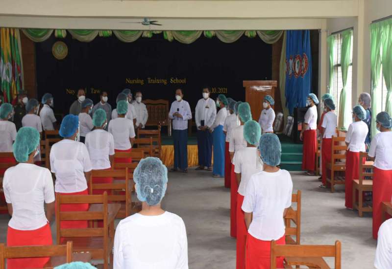 ကျန်းမာရေးဝန်ကြီးဌာန၊ ပြည်ထောင်စုဝန်ကြီး ဒေါက်တာသက်ခိုင်ဝင်းနှင့် နေပြည်တော် ကောင်စီ ဥက္ကဋ္ဌ၊ ဒေါက်တာ မောင်မောင်နိုင်၊ ကျန်းမာရေးဝန်ကြီးဌာန၊ ဒုတိယဝန်ကြီး ဒေါက်တာအေးထွန်း၊ နေပြည်တော်ကောင်စီဝင် ဗိုလ်မှူးကြီး မင်းနောင်တို့သည် ယနေ့ နံနက်ပိုင်းတွင် နေပြည်တော် (ခုတင်-၁၀၀၀)ဆေးရုံဝင်းအတွင်းရှိ သူနာပြုသင်တန်းကျောင်းသို့ သွားရောက်၍ သူနာပြုသင်တန်း တက်ရောက်လျက်ရှိသည့် သင်တန်းသား/သင်တန်းသူများကို တွေ့ဆုံ၍ ရင်းရင်းနှီးနှီး နှုတ်ဆက် အားပေးစကား ပြောကြားသည်။