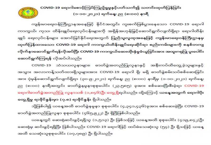 နိုင်ငံတော်အတွင်း၌ ကိုဗစ်-၁၉ ရောဂါ ကာကွယ်၊ ထိန်းချုပ်၊ ကုသရေးလုပ်ငန်းများအတွက် လိုအပ်သည့် အောက်ဆီဂျင်အရည်၊ အောက်ဆီဂျင်အိုးခွံ၊ အိမ်သုံးအောက်ဆီဂျင်စက်နှင့် အခြားဆက်စပ်ပစ္စည်းများကို လေကြောင်း၊ ရေကြောင်းနှင့် နယ်စပ်ကုန်သွယ်ရေး စခန်းများမှ အဆင်ပြေချောမွေ့စွာ တင်သွင်းနိုင်ရေးအတွက် စီးပွားရေးနှင့် ကူးသန်းရောင်းဝယ်ရေး ဝန်ကြီးဌာနသည် အခြားဆက်စပ် ဌာနများနှင့် လိုအပ်သည်များ ပူးပေါင်းဆောင်ရွက်ပေး လျက်ရှိရာ ယနေ့တွင် ရန်ကုန်အပြည်ပြည်ဆိုင်ရာ လေဆိပ်၊ ဆိပ်ကမ်းများနှင့် မူဆယ်၊ ချင်းရွှေဟော်နှင့် မြဝတီကုန်သွယ်ရေးစခန်း သုံးခုတို့မှ တင်သွင်းရာ၌ ကုမ္ပဏီသုံးခုမှ ယာဉ်စီးရေ ၂၁ စီးဖြင့် အောက်ဆီဂျင်(အိုးခွံ) ၂၇၅၁ ခု၊ အောက်ဆီဂျင် ထုတ်စက်နှစ်ခု၊ အိမ်သုံး အောက်ဆီဂျင်စက် ၆၀ နှင့် နှာခေါင်းစည်း ၁၁၃ တန်တင်သွင်းခဲ့ပြီး အောက်ဆီဂျင်ထုတ်စက် နှစ်ခုမှာ ရန်ကုန်မြို့သို့ဖြစ်ကြောင်း သိရသည်။