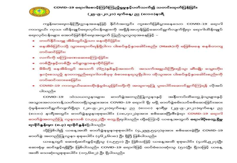 စီးပွားရေးနှင့်ကူးသန်းရောင်းဝယ်ရေး ဝန်ကြီးဌာနအနေဖြင့် ကိုဗစ်-၁၉ ရောဂါကာကွယ်၊ ထိန်းချုပ်၊ ကုသရေးဆိုင်ရာ ပစ္စည်းများကို လေကြောင်း၊ ရေကြောင်းနှင့် နယ်စပ်ကုန်သွယ်ရေးစခန်းများမှ အဆင်ပြေချောမွေ့စွာ တင်သွင်းနိုင်ရေးအတွက် အချိန်နှင့် တစ်ပြေးညီ စီစဉ်ဆောင်ရွက်ပေးလျက်ရှိရာ ယနေ့တွင် ရန်ကုန်အပြည်ပြည်ဆိုင်ရာလေဆိပ်၊ ဆိပ်ကမ်းများနှင့် ချင်းရွှေဟော်၊ ကန်ပိုက်တီနှင့် မြဝတီကုန်သွယ်ရေးစခန်း (၃)ခုတို့မှ တင်သွင်းရာ၌ ကုမ္ပဏီ (၃) ခုမှ ယာဉ်စီးရေ (၅) စီးဖြင့် အောက်ဆီဂျင်(အရည်) Bowser ယာဉ် (၁)စီးဖြင့် တန်(၂၀)၊ အောက်ဆီဂျင် (ဓါတ်ငွေ့) Bowser ယာဉ်(၁)စီးဖြင့် တန်(၂၀)၊ အောက်ဆီဂျင် (အိုးခွံ) အခု (၁၃၄၀)၊ Oxygen Plant (၃)ခု၊ အိမ်သုံး အောက်ဆီဂျင်စက် (Oxygen Concentrator) (၁၉၉)ခု၊ PPE ဝတ်စုံ (၂၀၀၀၀)၊ လက်အိတ် (၀ ဒသမ ၁၇) တန်နှင့် နှာခေါင်းစည်း (Mask) (၁) တန် တင်သွင်းခဲ့သည်။ အောက်ဆီဂျင် (အရည်) Bowser ယာဉ် (၁) စီးမှာ ရန်ကုန်မြို့နှင့် အောက်ဆီဂျင် (ဓါတ်ငွေ့) Bowser ယာဉ်(၁)စီးမှာ ပြည်မြို့ တို့သို့ဖြစ်ပြီး Oxygen Plant (၃) ခုမှာ ရန်ကုန်မြို့သို့ ဖြစ်ကြောင်း သိရသည်။