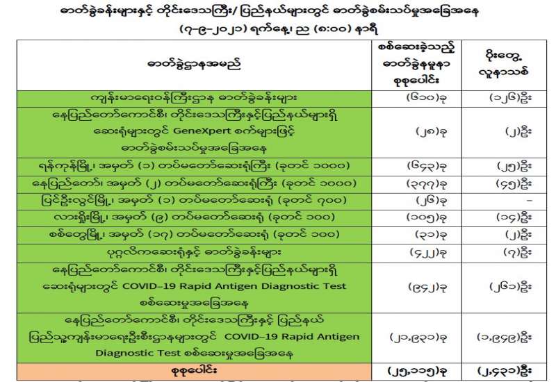 စီးပွားရေးနှင့်ကူးသန်းရောင်းဝယ်ရေးဝန်ကြီးဌာနအနေဖြင့် ကိုဗစ်-၁၉ ရောဂါကာကွယ်၊ ထိန်းချုပ်၊ ကုသရေးဆိုင်ရာပစ္စည်းများကို အများပြည်သူရုံးပိတ်ရက်များတွင်လေကြောင်း၊ ရေကြောင်း နှင့် နယ်စပ်ကုန်သွယ်ရေးစခန်းများမှ နှောင့်နှေးကြန့်ကြာမှုမရှိ တင်သွင်းနိုင်ရေးအတွက် အချိန်နှင့် တပြေးညီ စီစဉ်ဆောင်ရွက်ပေးလျက်ရှိရာ ယနေ့တွင် ဆိပ်ကမ်းများနှင့် မူဆယ်၊ ချင်း ရွှေဟော်၊ မြဝတီနှင့် ထီးခီးကုန်သွယ်ရေးစခန်း (၄) ခု တို့မှ တင်သွင်းရာ၌ ကုမ္ပဏီ (၂၂) ခုမှ ယာဉ်စီးရေ (၃၈) စီးဖြင့် အောက်ဆီဂျင်(အရည်) Bowser ယာဉ် (၃)စီး ဖြင့်(၅၇)တန်၊ အောက်ဆီဂျင် (အရည်) အိုးဖြင့် (၃) တန်၊ အောက်ဆီဂျင် (အိုးခွံ) (၁၉၇၅၇) ခု၊ Oxygen Plant (၁၃)ခု၊ Oxygen Generator (၃) ခု၊ အိမ်သုံး Oxygen Concentrator (၂၆၆၇) ခု၊ PPE ဝတ်စုံ (၆၇၅၀၀)၊ လက်အိတ် (၆) တန် နှင့် နှာခေါင်းစည်း (Mask) (၈၈) တန်တင်သွင်းခဲ့သည်။ အောက်ဆီဂျင် (အရည်) Bowser ယာဉ် (၃) စီးမှာ ရန်ကုန်မြို့၊ မန္တလေးမြို့နှင့် ပဲခူးမြို့တို့သို့ (၁)စီးစီဖြစ်ပြီး Oxygen Plant (၁၃)ခု မှာ ရန်ကုန်မြို့သို့ (၄)ခု၊ မန္တလေးမြို့သို့ (၇) ခု၊ မအူပင်မြို့နှင့် မြောင်းမြမြို့တို့သို့ (၁)ခု စီ ဖြစ်ကြောင်းသိရသည်။
