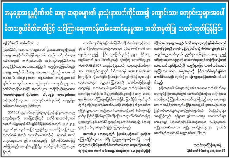 ကျန်းမာရေးဝန်ကြီးဌာနအနေဖြင့် နိုင်ငံအတွင်း ကူးစက်ဖြစ်ပွားနေသော COVID-19 ရောဂါ ကာကွယ်၊ ကုသ၊ ထိန်းချုပ်ရေးလုပ်ငန်းများကို အရှိန်အဟုန်မြှင့်ဆောင်ရွက်လျက်ရှိရာ ရောဂါ ထိန်းချုပ်ရေးလုပ်ငန်းများ အောင်မြင်နိုင်ရေးအတွက် ပြည်သူလူထုအနေဖြင့် -