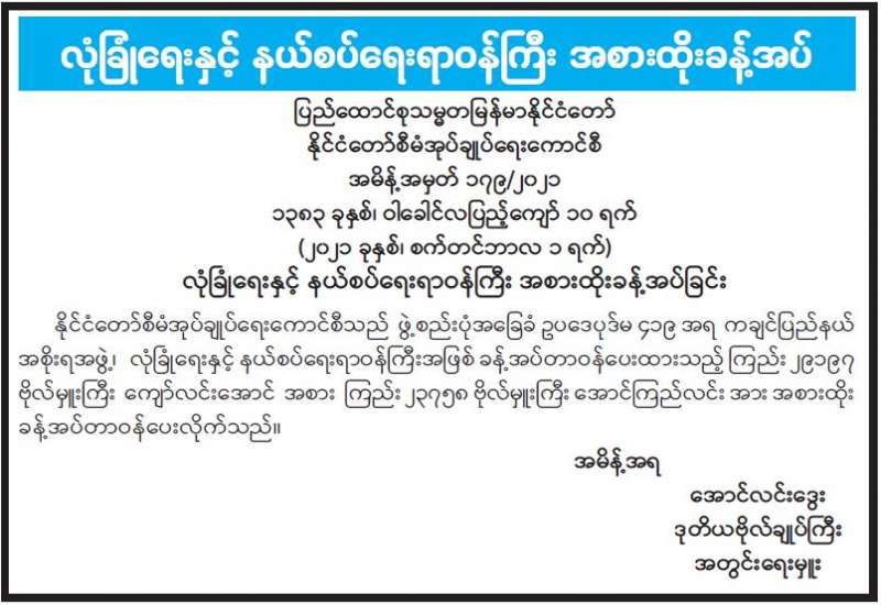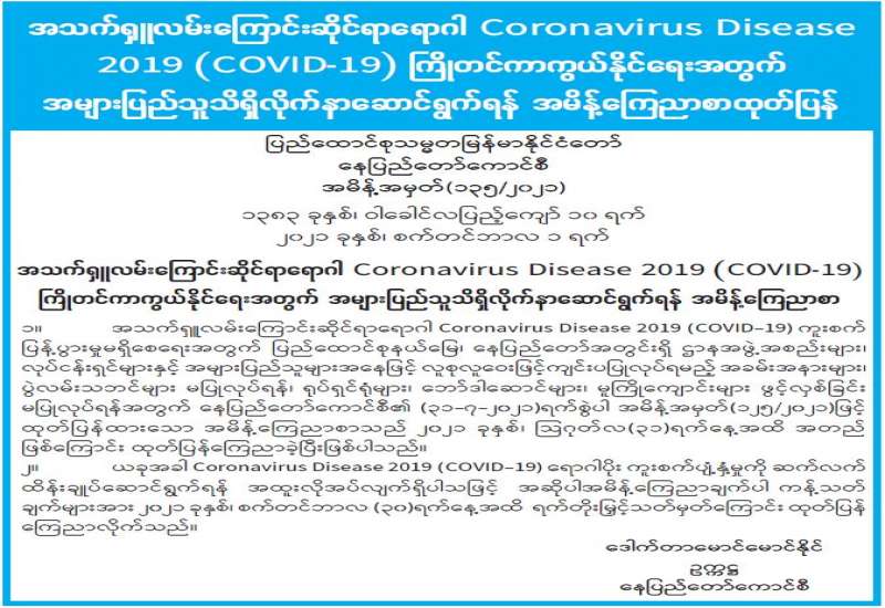 အကောက်ခွန်ဦးစီးဌာနအနေဖြင့် ကိုဗစ်-၁၉ ရောဂါ ကာကွယ်၊ ထိန်းချုပ်၊ ကုသရေးပစ္စည်းများအား လေကြောင်း၊ ဆိပ်ကမ်း၊ နယ်စပ်ဂိတ်အသီးသီးမှ ရုံးပိတ်ရက်ရှည်ကာလအတွင်း နေ့စဉ်ရုံးပိတ်ရက် မရှိ လွယ်ကူချောမွေ့စွာ စစ်ဆေးထုတ်ပေးလျက်ရှိသည်။