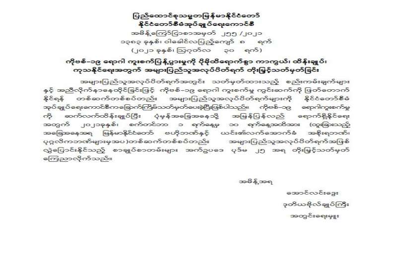 ကိုဗစ်-၁၉ ရောဂါ ကူးစက်ပြန့်ပွားမှုကို ပိုမိုထိရောက်စွာ ကာကွယ်၊ ထိန်းချုပ်၊ ကုသနိုင်ရေးအတွက် အများပြည်သူ အလုပ်ပိတ်ရက် တိုးမြှင့်သတ်မှတ်ခြင်း