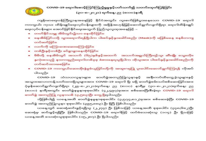 မြန်မာ့အသံနှင့် ရုပ်မြင်သံကြားမှ ဩဂုတ် ၂၈ ရက် ည ၈နာရီ သတင်းအပြီးတွင် ထုတ်လွှင့်ပြသခဲ့သည့် ကိုဗစ် - ၁၉ ရောဂါ ကာကွယ်ထိန်းချုပ်ရေးဆိုင်ရာ ဆောင်ရွက်ချက်များအကြောင်း သိကောင်းစရာ အစီအစဉ်ကို ပြည်သူများသိရှိနိုင်ရန်အတွက် ပြန်လည်ဖော်ပြလိုက်ပါသည်။