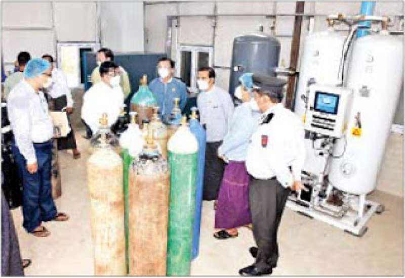 နေပြည်တော် ပုဗ္ဗသီရိမြို့နယ် တပင်ရွှေထီးရပ်ကွက်ရှိ နေပြည်တော် ပြည်သူ့ ဆေးရုံကြီး ခုတင် (၃၀၀) ဝန်းအတွင်း တည်ဆောက်ထားသည့် ကျန်းမာရေး ဝန်ကြီးဌာန၊ ကုသရေးဦးစီးဌာန အောက်ဆီဂျင် ထုတ်လုပ်သည့်စက်ရုံ (Liquid Oxygen Plant) (နေပြည်တော်) ကို ယနေ့နံနက်ပိုင်းတွင် စတင်ဖွင့်လှစ်ရာ ကျန်းမာရေးဝန်ကြီးဌာန ပြည်ထောင်စုဝန်ကြီး ဒေါက်တာသက်ခိုင်ဝင်း၊ ဆောက်လုပ်ရေး ဝန်ကြီးဌာန ပြည်ထောင်စုဝန်ကြီး ဦးရွှေလေး၊ နေပြည်တော်တိုင်းစစ်ဌာနချုပ် တိုင်းမှူး ဗိုလ်ချုပ်ဇော်မျိုးတင်၊ နေပြည်တော်ကောင်စီဝင် ဗိုလ်မှူးကြီးမင်းနောင်နှင့် တာဝန်ရှိသူများသည် စက်ရုံ အတွင်း အောက်ဆီဂျင် ထုတ်လုပ်နေမှု အခြေအနေကို လှည့်လည်ကြည့်ရှုစစ်ဆေးရာ ဆေးရုံအုပ်ကြီး ဒေါက်တာသီတာစိုးနှင့် တာဝန်ရှိသူများက အောက်ဆီဂျင် ထုတ်လုပ်မှု အဆင့်ဆင့်၊ ထုတ်လုပ်နိုင်မှုနှင့် ဖြန့်ဖြူးသွားမည့် အခြေအနေများကို လိုက်လံရှင်းလင်း ပြသကြသည်။