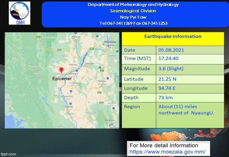 ၂၀၂၁ ခုနှစ်၊ သြဂုတ်လ (၅)ရက်နေ့၊ မြန်မာစံတော်ချိန် (၁၇)နာရီ၊ (၂၄)မိနစ်၊ (၄၀)စက္ကန့်အချိန် တွင် ညောင်ဦးမြေငလျင်စခန်းမှ အနောက်မြောက်ဘက် (၁၁)မိုင်ခန့်အကွာ၊ မြန်မာနိုင်ငံပြည်တွင်း (ညောင်ဦးမြို့၏ အနောက်မြောက်ဘက် (၁၁)မိုင်ခန့်အကွာ)၊ မြောက်လတ္တီတွဒ် (၂၁.၂၅)ဒီဂရီ၊ အရှေ့ လောင်ဂျီတွဒ် (၉၄.၇၄)ဒီဂရီ၊ အနက်(၇၃)ကီလိုမီတာကို ဗဟိုပြု၍ အင်အားရစ်(ခ်)တာစကေး (၃.၆) အဆင့်ရှိ အင်အားအနည်းငယ်ရှိသော မြေငလျင်တစ်ခု လှုပ်ရှားသွားကြောင်း တိုင်းထွာရရှိပါသည်။