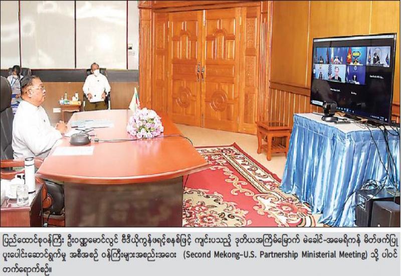 နိုင်ငံခြားရေးဝန်ကြီးဌာန ပြည်ထောင်စုဝန်ကြီး ဦးဝဏ္ဏမောင်လွင်သည် ယနေ့ နံနက်ပိုင်းတွင် ဗီဒီယိုကွန်ဖရင့်စနစ်ဖြင့် ကျင်းပသည့် ဒုတိယ အကြိမ်မြောက် မဲခေါင်-အမေရိကန် မိတ်ဖက်ပြု ပူးပေါင်းဆောင်ရွက်မှု အစီအစဉ် ဝန်ကြီးများအစည်းအဝေး(Second Mekong-U.S. Partnership Ministerial Meeting) သို့ နေပြည်တော်ရှိ နိုင်ငံခြားရေး ဝန်ကြီးဌာနမှ ပါဝင်တက်ရောက်သည်။