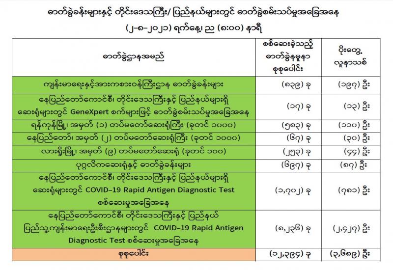 (၁-၈-၂၀၂၁)ရက်နေ့၊ ည (၈:၀၀)နာရီမှ (၂-၈-၂၀၂၁)ရက်နေ့၊ ည (၈:၀၀)နာရီအတွင်း ဓာတ်ခွဲနမူနာစုစုပေါင်း (၁၂,၃၉၄)ခုအား စစ်ဆေးပြီးစီးခဲ့ရာ COVID-19 ရောဂါ ဓာတ်ခွဲအတည်ပြုလူနာသစ် (၃,၆၈၉)ဦး တွေ့ရှိရပါသည်။ သို့ဖြစ်ပါ၍ ယနေ့အထိ ဓာတ်ခွဲနမူနာစုစုပေါင်း (၃,၁၈၁,၈၅၉)ခုအား စစ်ဆေးခဲ့ပြီး COVID-19 ဓာတ်ခွဲအတည်ပြုလူနာ စုစုပေါင်း (၃၀၆,၃၅၄) ဦး ရှိပြီ ဖြစ်ပါသည်။
