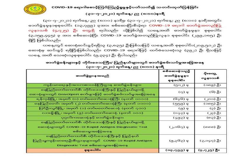 စီးပွားရေးနှင့် ကူးသန်းရောင်းဝယ်ရေးဝန်ကြီးဌာနအနေဖြင့် ကိုဗစ်-၁၉ ရောဂါဖြစ်ပွားမှုနှုန်း ထိန်းချုပ်နိုင်ရေးအတွက် ကုသရေးဆိုင်ရာ ဆေးဝါးနှင့် ဆက်စပ်ပစ္စည်းများ ပြည်ပမှတင်သွင်းခွင့် အတွက် သွင်းကုန်လိုင်စင်လျှောက်ထားခြင်းမှ ယာယီကင်းလွတ်ခွင့်ပြုပေးခြင်းနှင့် နယ်စပ်ဒေသများမှ တင်သွင်းရာတွင် လွယ်ကူအဆင်ပြေစေရေးအတွက် နယ်စပ်ကုန်သွယ်ရေးစခန်းများ ရုံးပိတ်ရက် မရှိ ဆောင်ရွက်ပေးလျက်ရှိသည်။ ထို့ပြင် ရုံးပိတ်ရက်ကာလအတွင်း အဆင်ပြေချောမွေ့စွာ တင်သွင်းနိုင်ရေး အတွက် သက်ဆိုင်ရာ ဌာနများမှ ထုတ်ပြန်ထားသည့် အသိပေးကြေညာချက်များ၊ တာဝန်ရှိသူများ ညှိနှိုင်းထားသည့် SOP များနှင့်အညီ လွယ်ကူမြန်ဆန်နိုင်ရေးအတွက် ပူးပေါင်း ဆောင်ရွက်ပေးလျက် ရှိသည်။